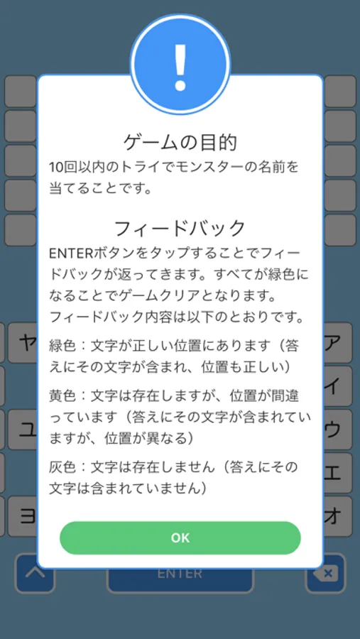 ゲームの目的は10回以内のトライでモンスターの名前を当てることだ。