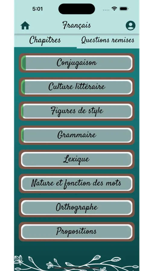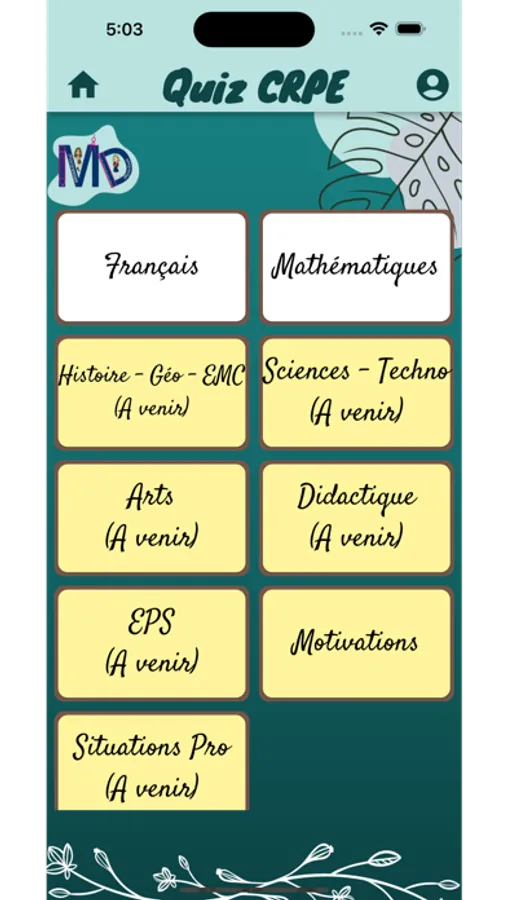 L'utilisateur choisit un domaine et une sous-catégorie (exemple: français ; conjugaison).