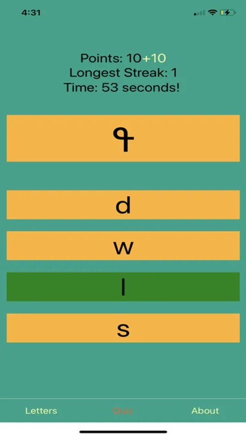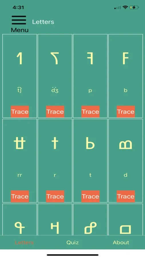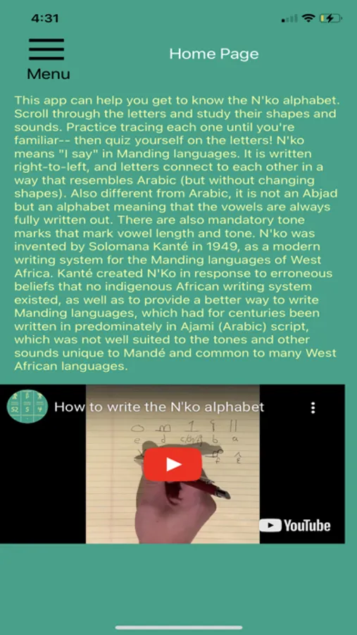 This app can help you get to know the N'ko alphabet. Scroll through the letters and study their shapes and sounds. Practice tracing each one until you're familiar-- then quiz yourself on the letters!