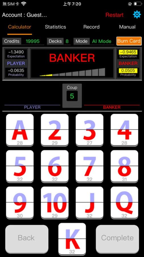 You can view the changes in probabilities and Expectation Value for each card drawn during the calculation process on the “Statistical” page of the software.