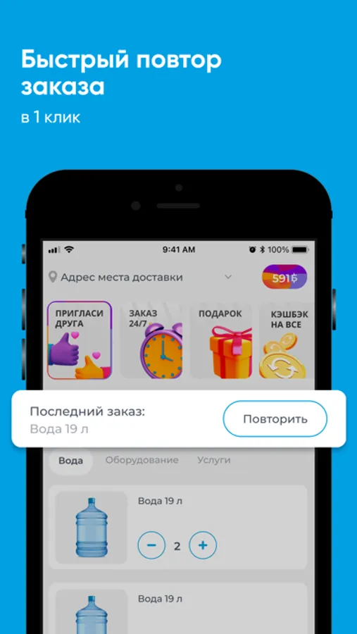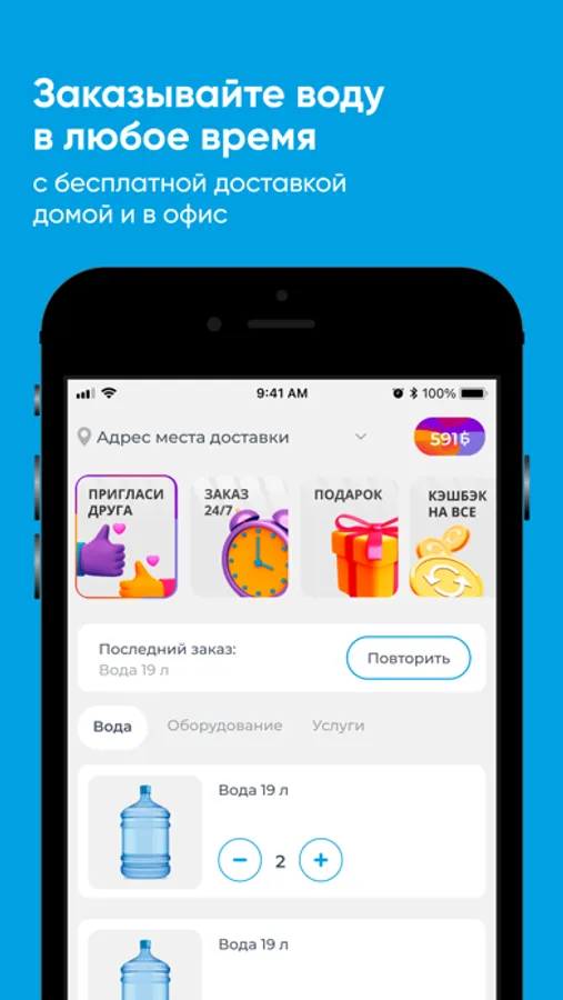 Скачайте приложение Амзай на свой смартфон и делайте заказ воды 24/7. Вы сможете повторять заказ нажатием одной кнопки, видеть всю историю покупок и быть в курсе всех акций компании.