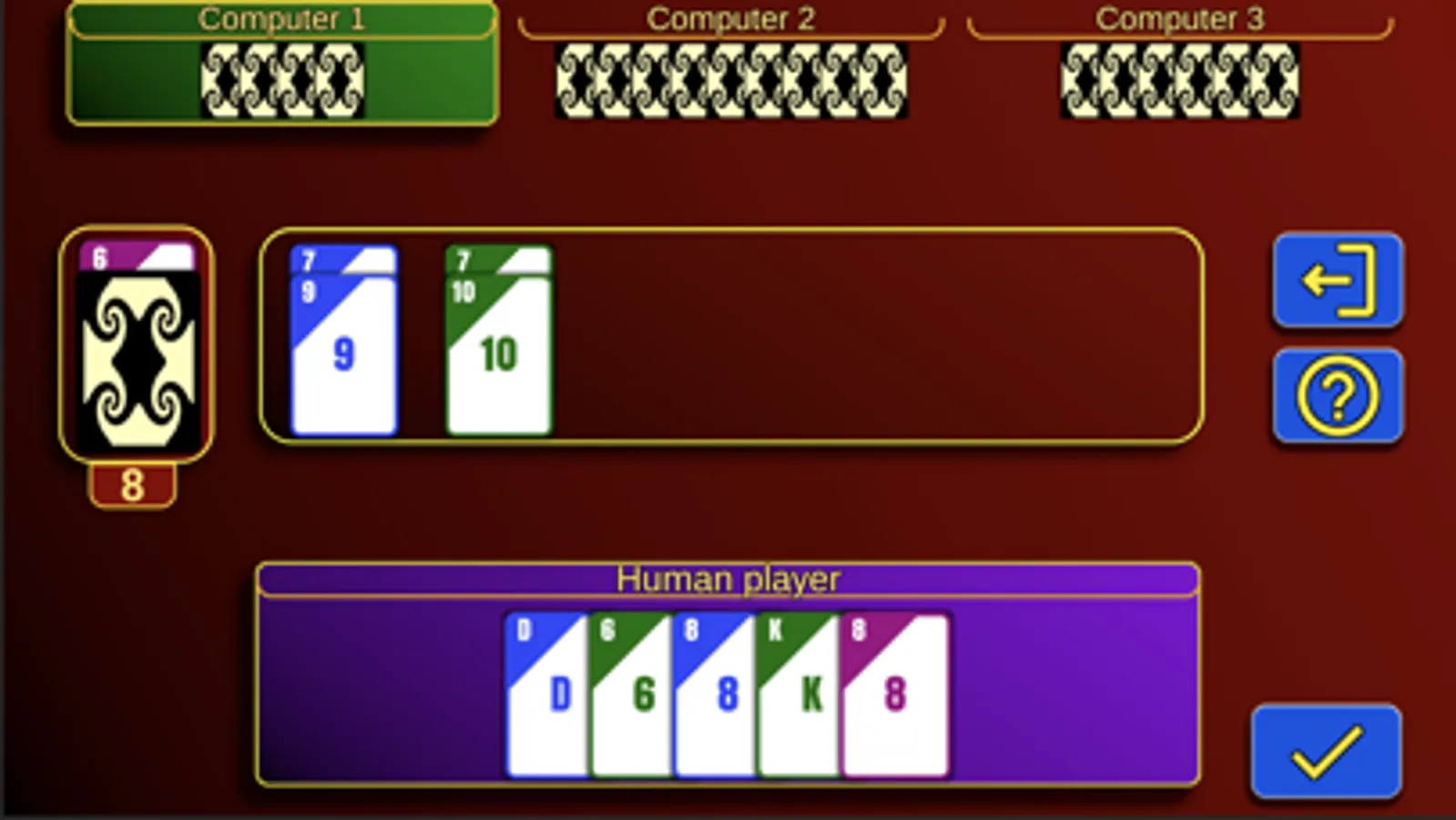 The game consists of a total of 36 cards divided into four suits. The purple suit represents the joker or trump suit. Trump cards have the ability to cover all cards of other suits, while trump cards of different trump suits can be beaten based on their value.