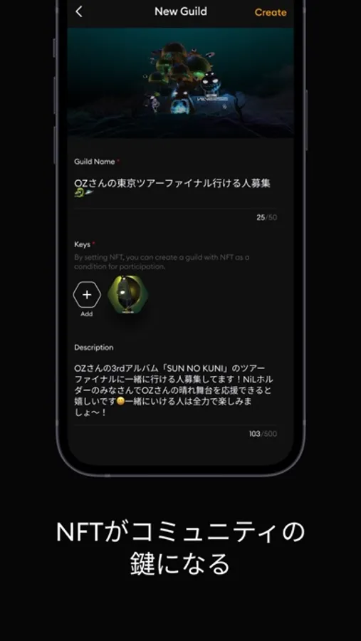 NFTコレクションを鍵としたギルドを立ち上げることができます。参加できるのは、同じコレクションを持った人のみです。