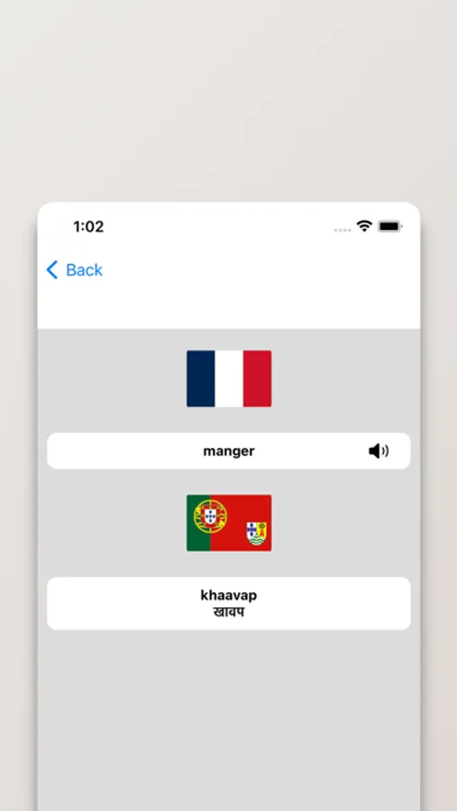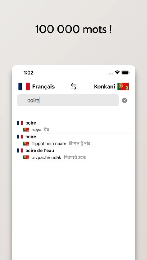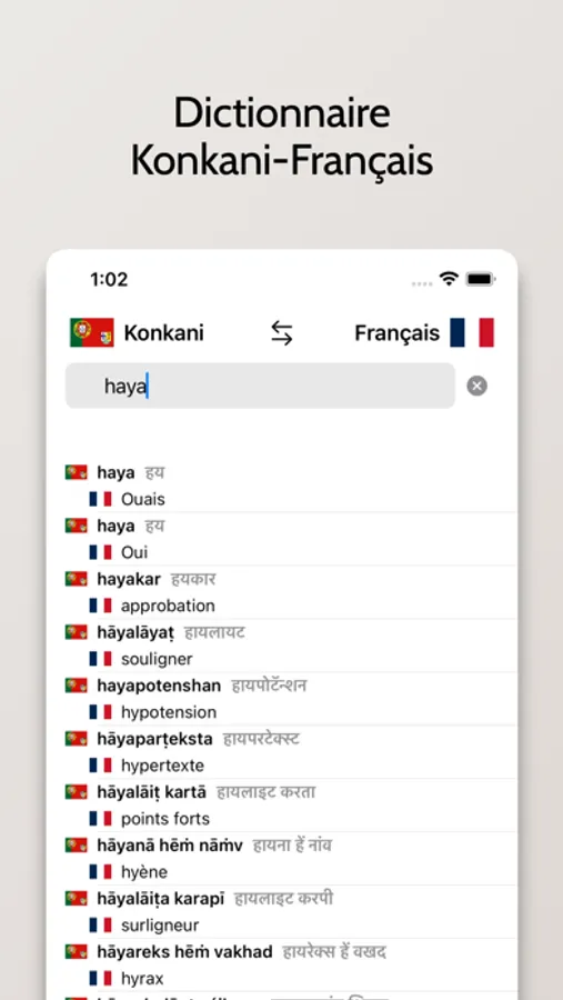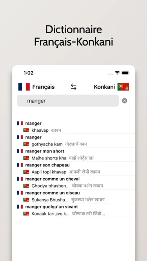 - Possibilité de rechercher à partir de mots en Français ou en Konkani