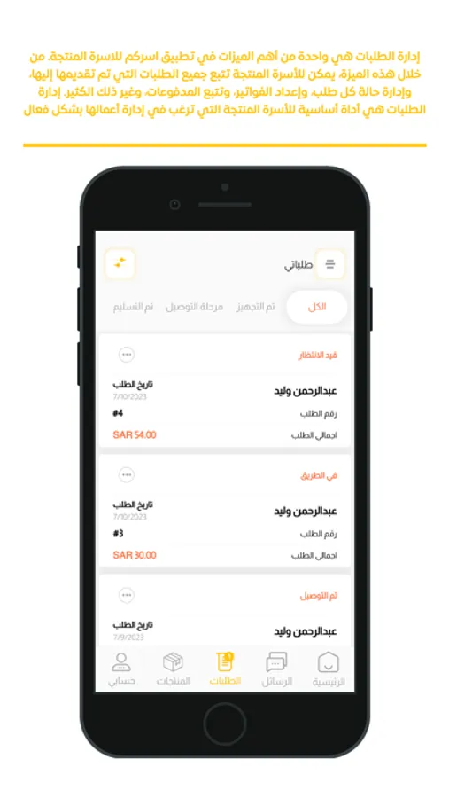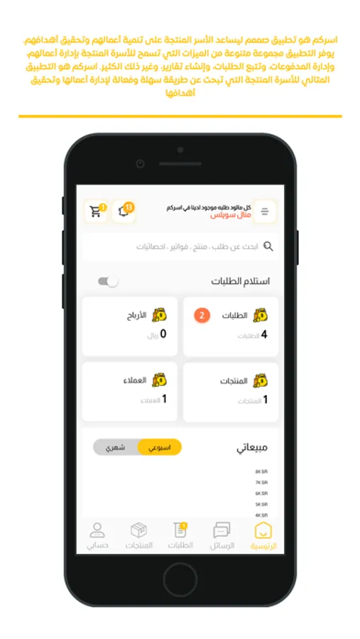 تتمكن الاسر المنتجة من ادارة المنتجات باضافة وحذف وتعديل اي منتج واستلام الطلبات وتحديد طريقة توصيل المنتج حيث يمكن التوصيل بواسطة الاسرة المنتجة او بواسطة مناديب التوصيل المستقلين الذين قامو بالتسجيل في التطبيق