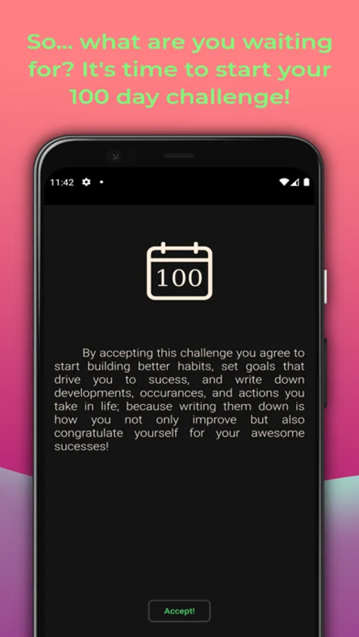 100 Days is an app designed to help you build great habits and challenge yourself to become a better, more successful person using 100 day time-frames. Which keep you motivated and progressing quickly down a path to a better, happier life!