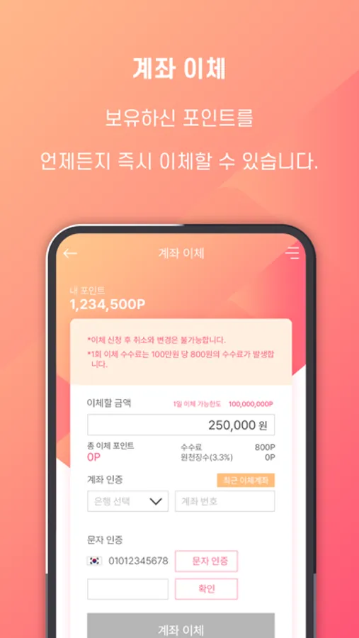 보유 포인트는 즉시 계좌이체가 가능하며 회원 간 전송도 됩니다.