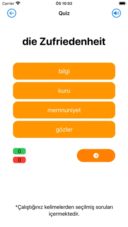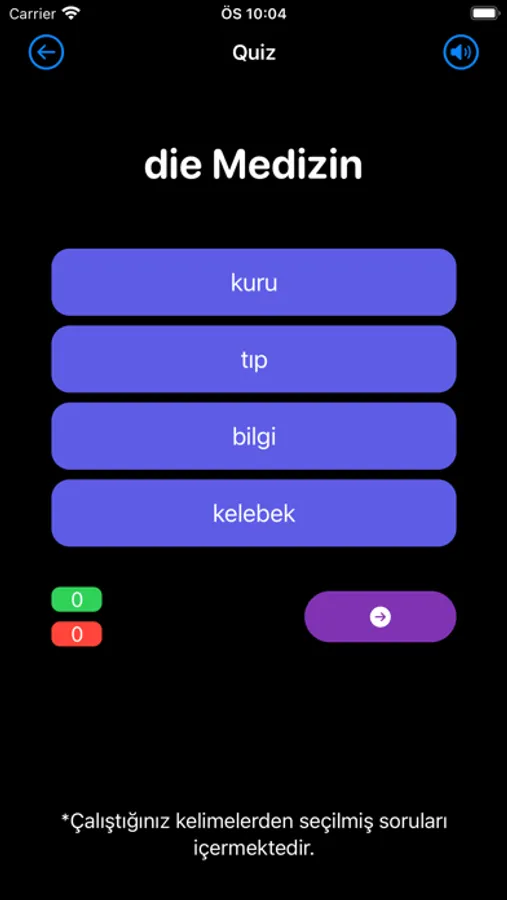Çalıştığınız kelimelerden oluşan quiz soruları ya da karma kelimelerden oluşan genel test sorularıyla kendinizi sınayabilirsiniz.