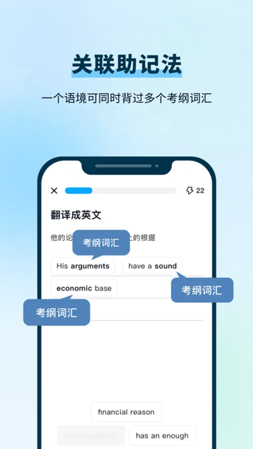 - 一个学习语境中融入多个考纲词汇,实现一道题目多个单词记忆与巩固,加快背诵速度