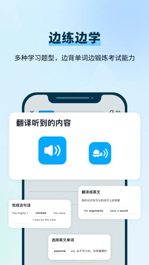 - 模拟考试场景,将背单词和考试有机结合,背单词的同时锻炼临场考试能力