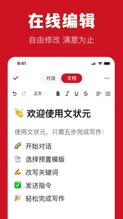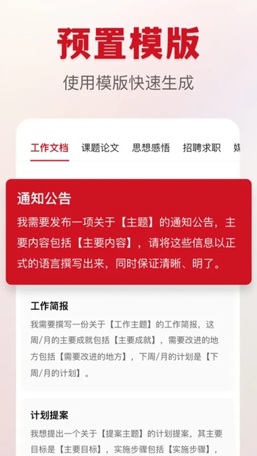 文状元是一款智能应用文,公文,写作助手,专为繁忙的文秘们设计。无论是应用文还是公文,它都能轻松解决你的写作难题。通过文状元AI写作助手,让你的写作更加高效,工作更加轻松惬意。