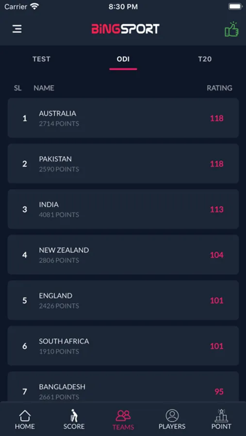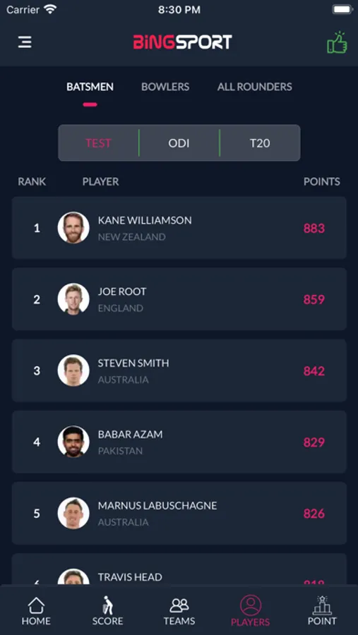 » Cricket ICC ranking of players like Test, ODI and T20.