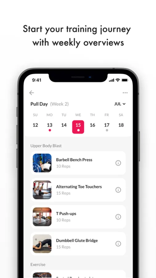 Finally, you’ll spend most of your time in the Train tab. Here, you’ll have a full breakdown of your program week over week. See what days you need to train, the overview of exercises for that day, and then click into the plan to get started.