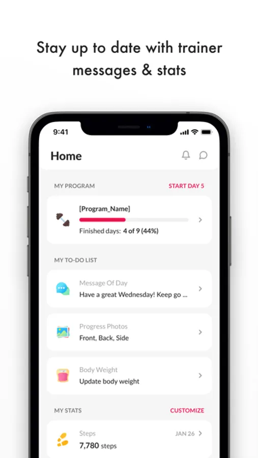 From the home page, view the messages from your fitness coach, view your daily fitness statistics, and see your daily nutrition overview. On this page, we also work with the Apple Health App to keep track of your steps and calories burned.