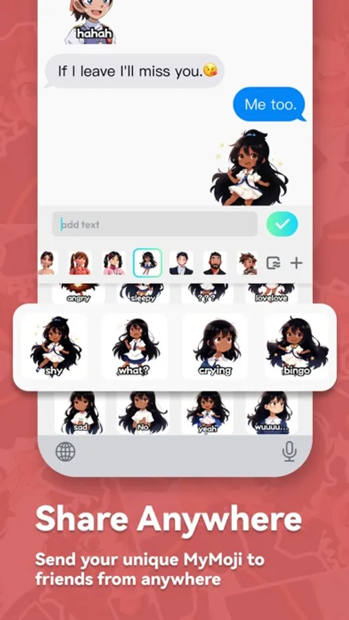 Infuse your personality into emojis by designing your own unique MyMoji characters. From playful to solemn, MyMoji Keyboard allows you to capture your essence and send these expressive creations to anyone, anywhere.