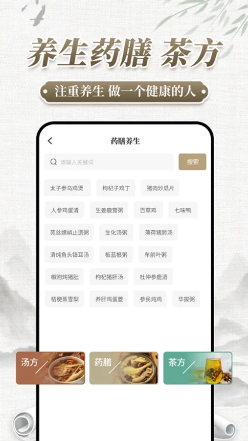 包含了药膳、汤方、茶方三种类型的养生方法,通过改善饮食习惯来增强体质、预防疾病,维护您的身心健康!