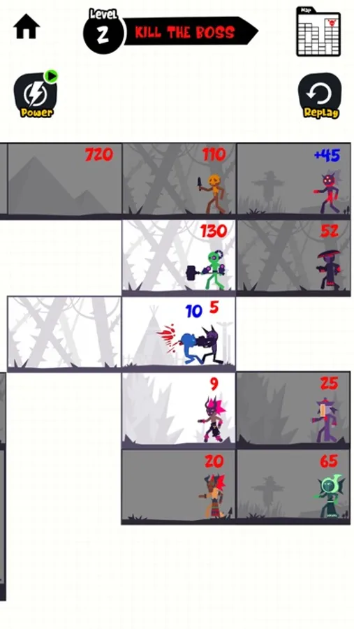 Stickman Fight, the ultimate combat game where you take control of a fearless stickman warrior. Engage in intense battles as you navigate through challenging levels, strategically defeating menacing monsters lurking in each square. With your scores prominently displayed, strive to surpass the score displayed above your stickman's head. Get ready for non-stop action and become the hero of the stick war!