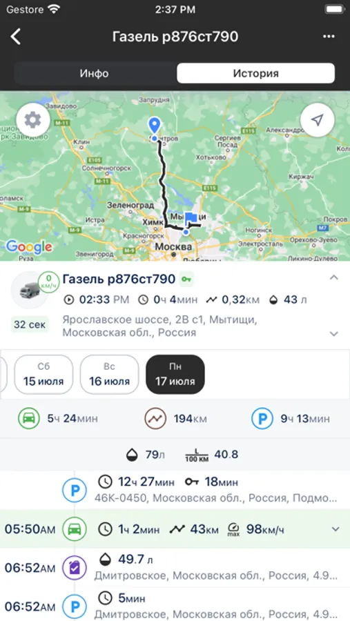 - Возможность просматривать исторические данные о передвижении за определенный период времени.