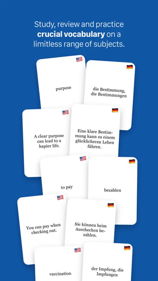 With as little or as much information as you want to provide, you can generate flashcard decks packed with relevant words and example phrases to learn and practice German. The app’s AI generates the perfect vocabulary list with example sentences to prepare you for any situation in which you may find yourself.