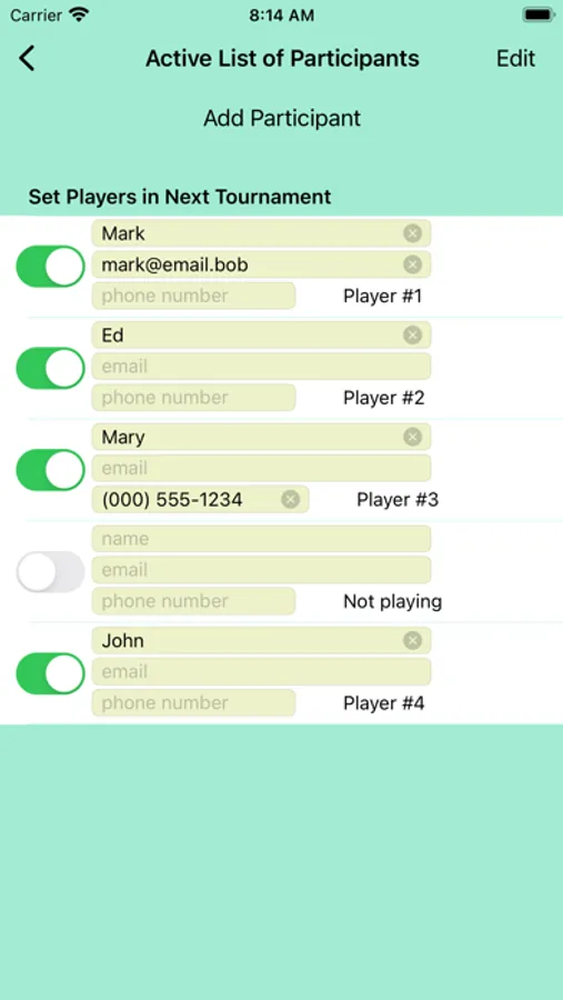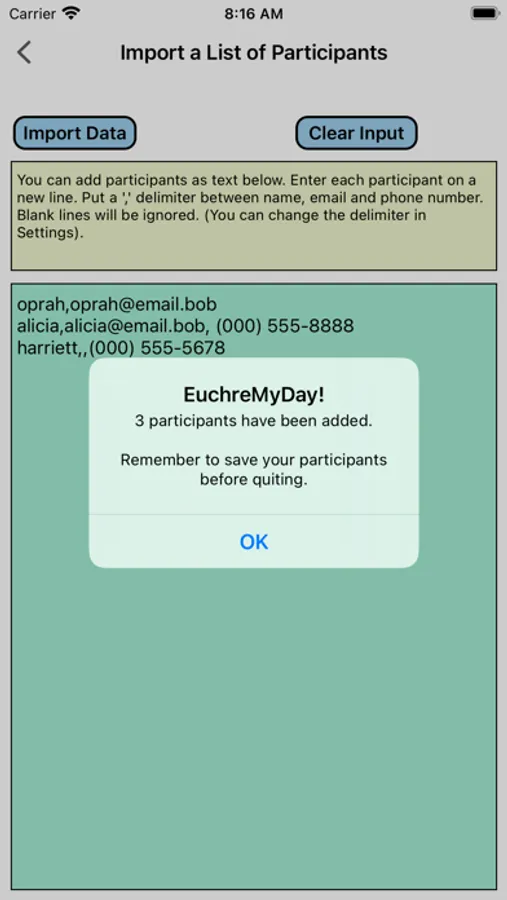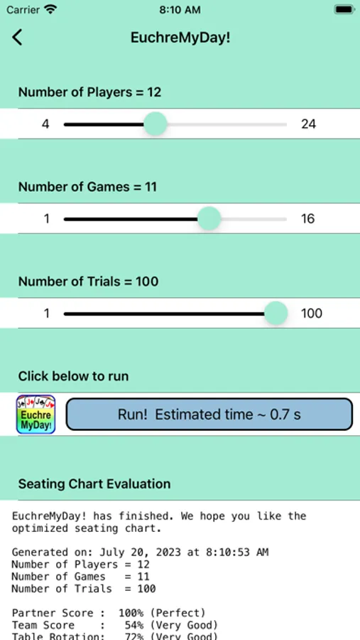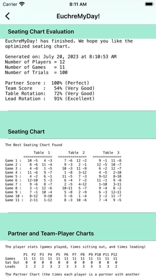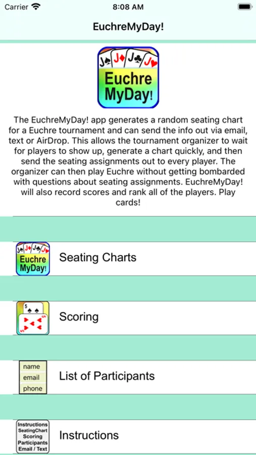 Plan Euchre Tournaments, Score Games, and Distribute Final Scores. EuchreMyDay! generates random seating charts and attempts to match every player with every other player as a partner. Easily score the games. Final scores are tallied and can be easily shared with all players via email, text message, or AirDrop. Player information can be entered to generate specific player instructions. The app is designed to make last minute changes to a tournament in case some people don't show up. Seating charts are random and "fair". EuchreMyDay! can handle cases when there aren't enough players for full tables. Detailed instructions explain how to use the App. Seating charts and player information can be saved for future use.