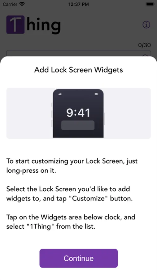 1. Lock Screen Widget Integration: The 1Thing seamlessly integrates with the lock screen widget on your iOS device, displaying a clear and prominent reminder for your one crucial task. It ensures that your reminder is always in sight, even when your device is locked.
