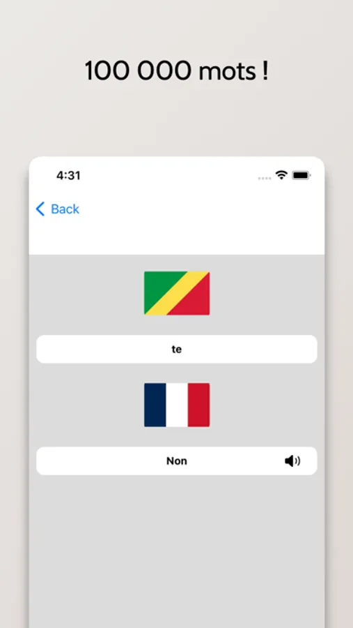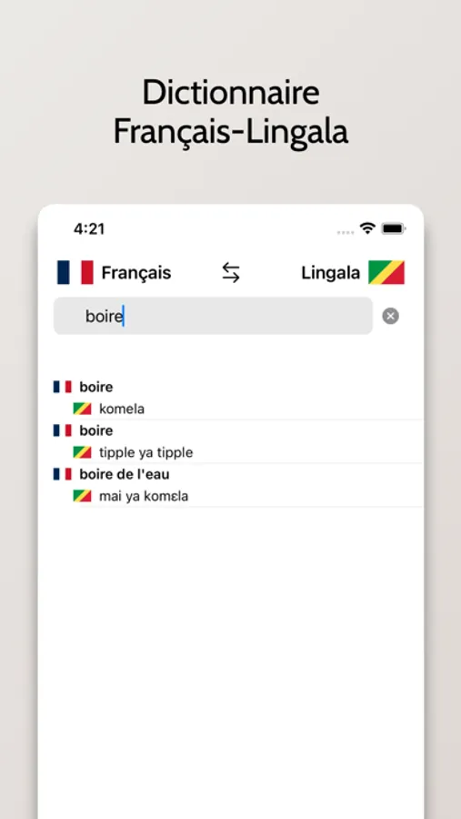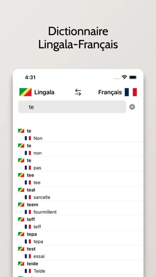 - Possibilité de rechercher à partir de mots en Français ou en Lingala