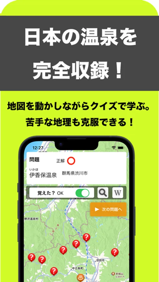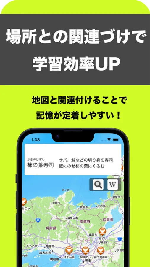 地図を動かしながらその場所に関連することがらを覚えることができます。