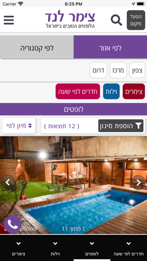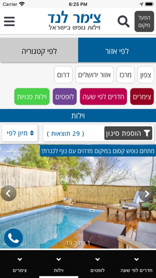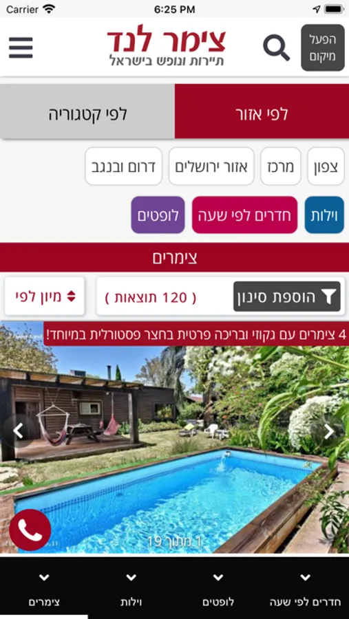 באפליקציה תוכלו למצוא אלפי צימרים בכל ישראל, וילות, לופטים וחדים לפי שעה באמצעות קליקים בודדים כולל אפשרות לסינון על פי מרחק ממך כך שתמצאו את הצימר הכי קרוב אליכם