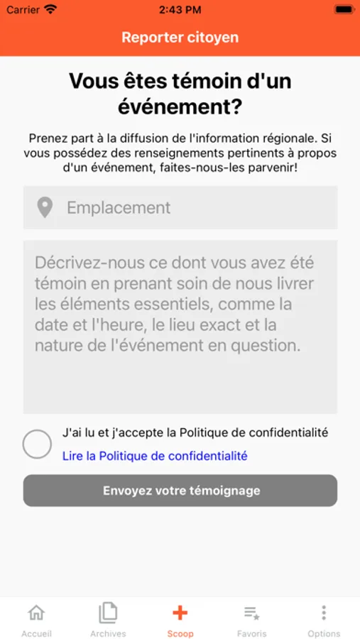 Témoin d'un événement? Transmettez-nous vos images grâce à la fonction « Scoop ». Partagez les nouvelles qui vous interpellent ou ajoutez-les à vos favoris.