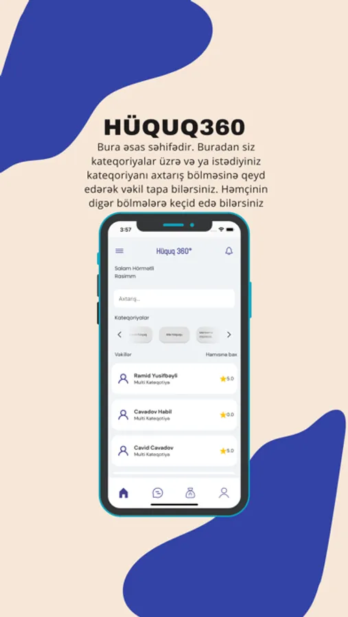 • Axtarış və kateqoriyalar: Axtardığı vəkili tapmaq üçün istifadəçilər əsas səhifədə mərkəz üst-də yerləşən axtarış bölməsinə uyğun kateqoriyanı yazaraq axtarış edə bilərlər.Həmçinin axtarış bölməsinin aşağı tərəfində yerləşən kateqoriyalar bölməsindən istifadə edərək də uyğun vəkili tapa bilərlər.