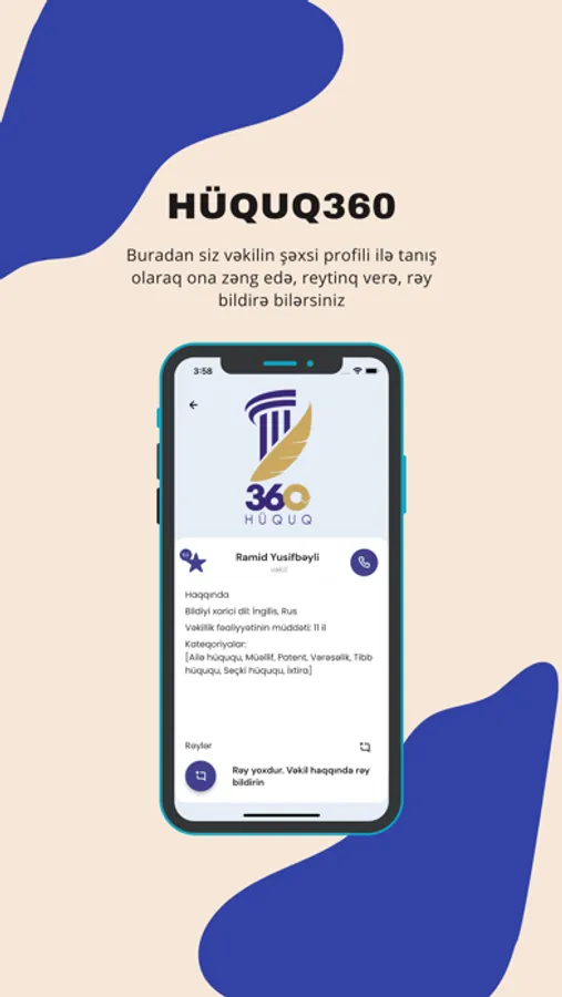 • Onlayn Konsultasiya: Hüquqi məsləhət və ya əsas konsultasiyalar üçün istifadəçilər, onlayn qaydada vəkillərlə görüşlər təşkil edə bilər. Bunun üçün istifadəçilər vəkilin şəxsi profilindəki müvafiq zəng etmək düyməsinə toxunaraq konsultasiyanı həyata keçirə bilərlər.
