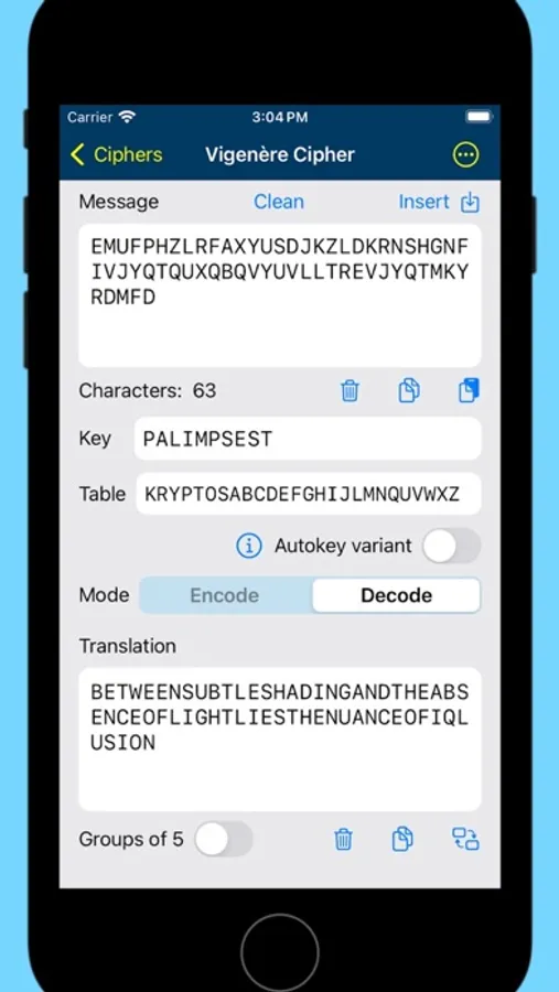Kryptos Tools combines the best features of the previous two apps (Kryptos Tools - Vigenère and Kryptos Tools - Transposition) along with additional details, documents and photos consolidated into one great app. Kryptos Tools includes classic ciphers, like the Vigenère cipher, that was used to encrypt the first two sections of Kryptos (K1 and K2). It also includes the Transposition Matrix which provides a visual implementation of the Transposition cipher for solving Kryptos section K3.