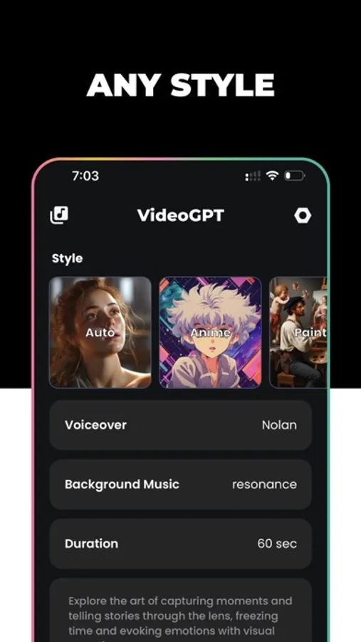 Introducing VideoGPT, the groundbreaking app that allows you to transform your words into stunning video stories in seconds. With VideoGPT, the possibilities are limitless as you bring your ideas to using a range of captivating styles, from Cinematic to Anime and everything in between.
