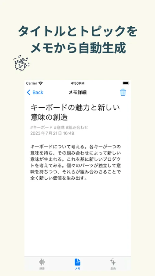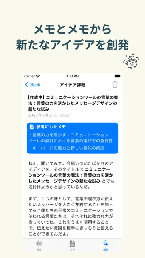 IdeaPotは、音声入力によるメモ作成からテキスト入力によるメモ作成、そしてその内容の自動的なタイトル・トピック生成に至るまで、あなたのアイデア創出を強力にサポートします。また、蓄積されたメモをランダムに組み合わせて新たなアイデアを生み出す機能もあります。従来のメモアプリでは得られない、新しい視点や発想を提供します。