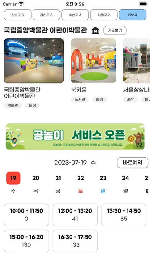 국립 중앙 박물관, 서울형 키즈카페, 강남구 어린이 실내 놀이터 등 각종 기관과 지자체에서 질 좋고 저렴한 가격에 이용할 수 있는 어린이들을 위한 시설들을 운영하고 있습니다. 이런 시설들의 예약 가능 여부를 통합하여 볼 수 있도록 구성하였습니다.