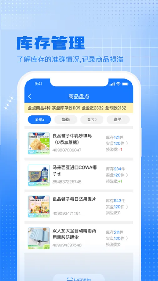 ● 报损与报溢:在日常运营中,偶尔会出现商品损坏或数量超过预期的情况。我们的应用程序可以帮助您记录并处理这些问题。您可以快速输入损坏或溢出的商品信息,并生成相应的报告,以便进行调整和财务核算。