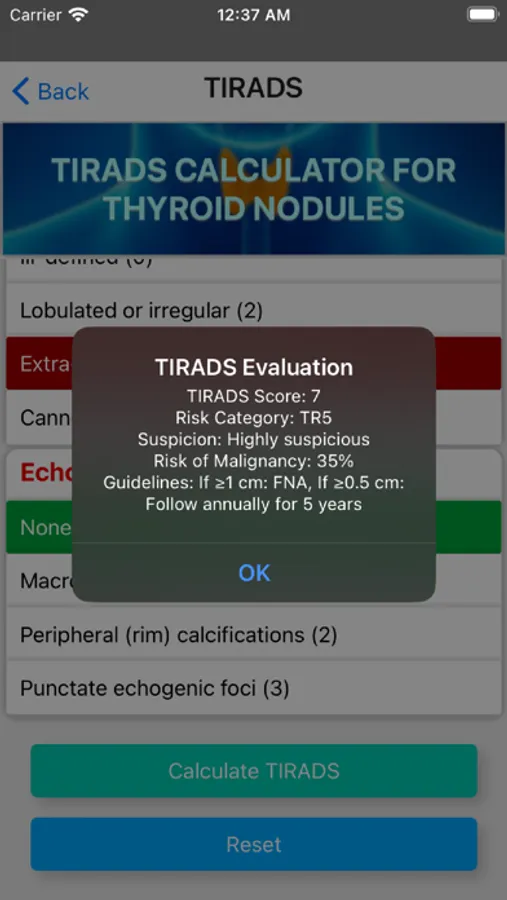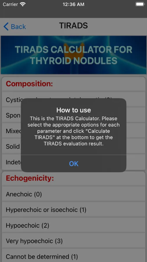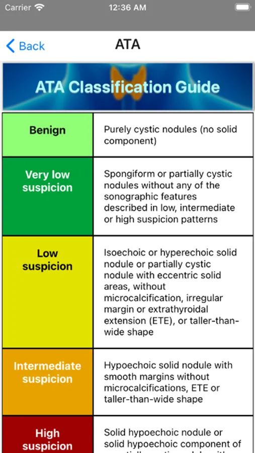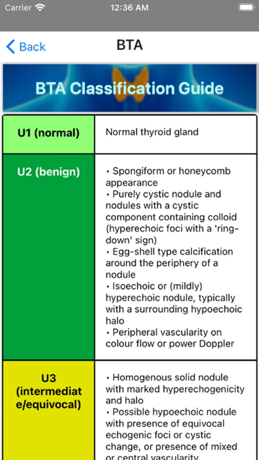 The App is a Thyroid Nodule Classification Tool which allows the user to use a TIRADS calculator and provides access to the ATA and BTA classification guides. The institutions which provide the information within the app can be found in the references section of the app.