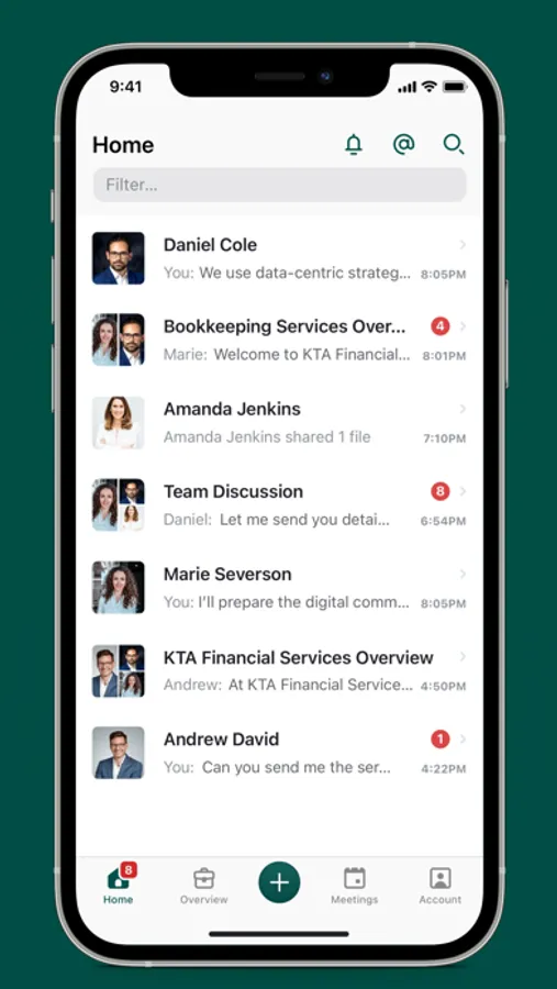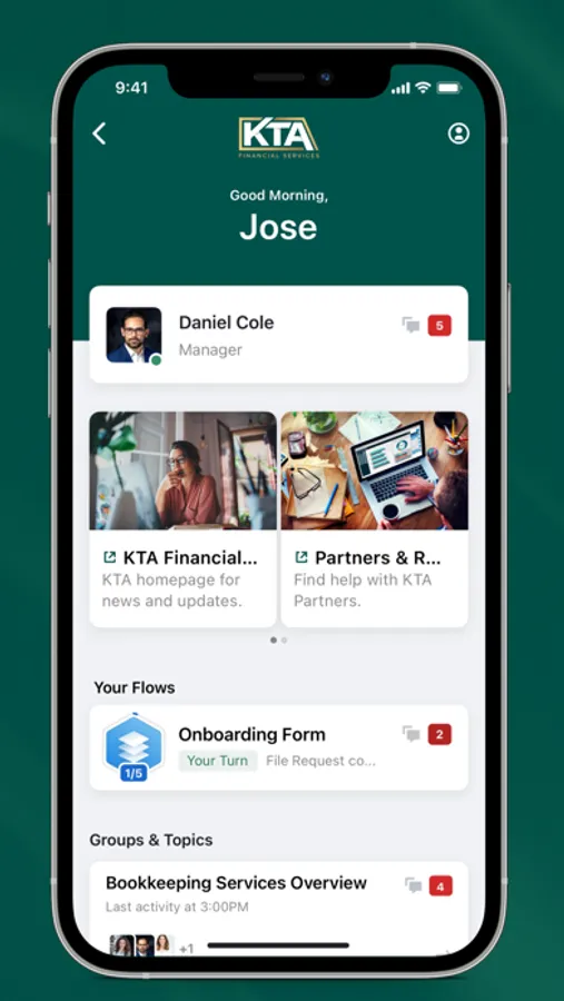 Download the KTA Financial Services mobile app to access your financial statements, upload documentation, receive important notifications, and collaborate in real time with our world class accounting team. Our app supports secure messaging, video meetings, document sharing, digital signature, and more capabilities for a seamless financial services experience from your mobile device.