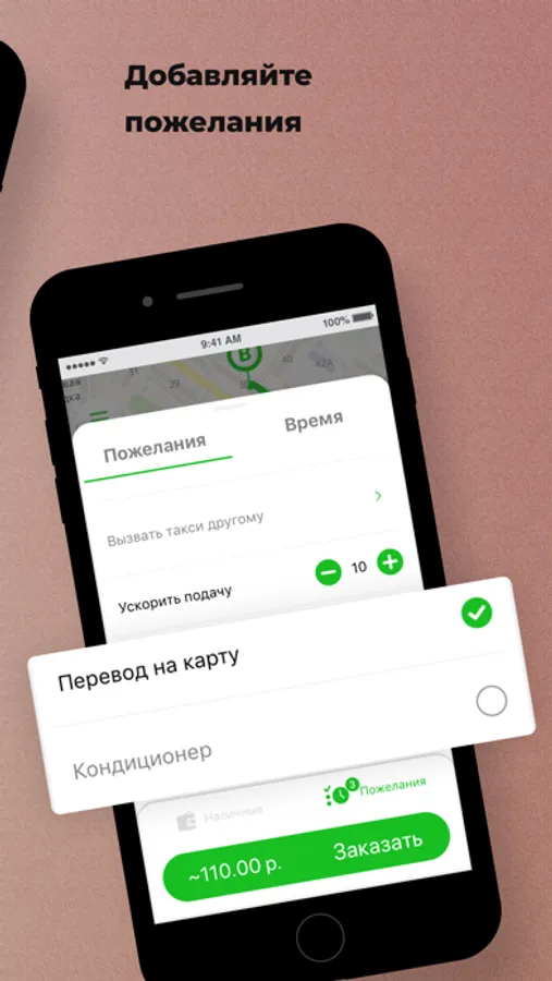 Добавьте к заказу дополнительные пожелания. Например, когда на улице +35 — выберите "кондиционер". Если вы не переносите запах табака — укажите "Некурящий салон", и к вам приедет некурящий водитель.