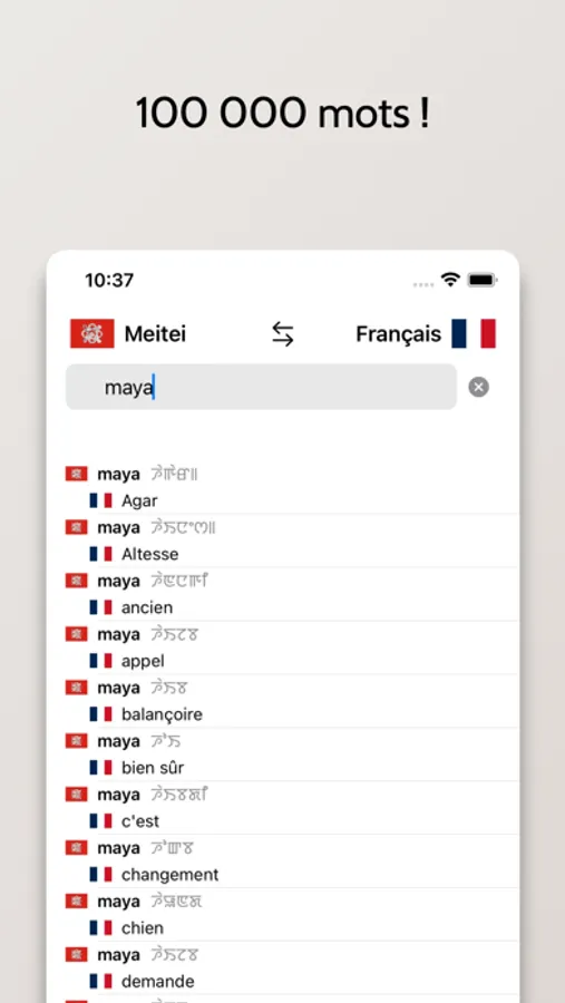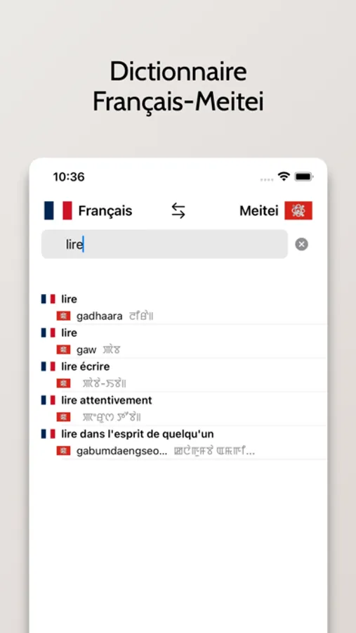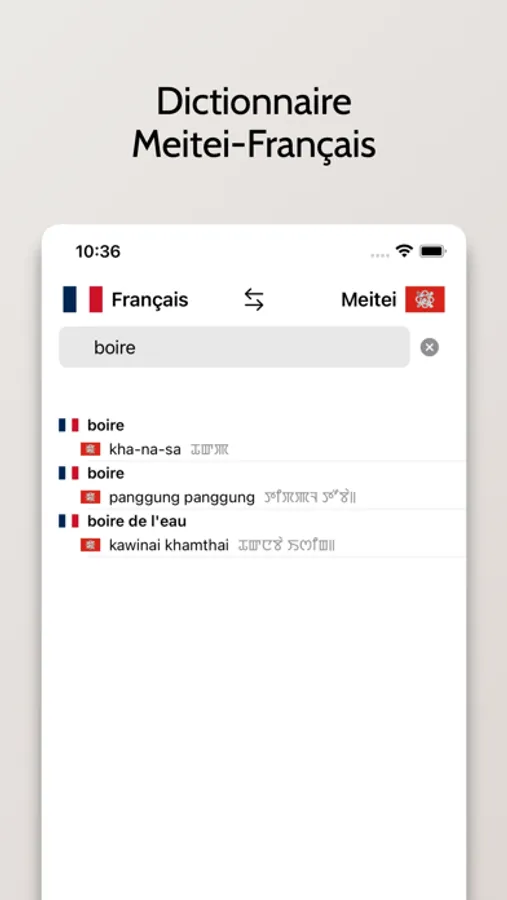 - Possibilité de rechercher à partir de mots en Français ou en Meitei