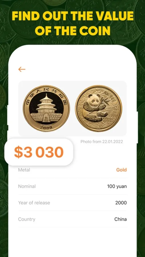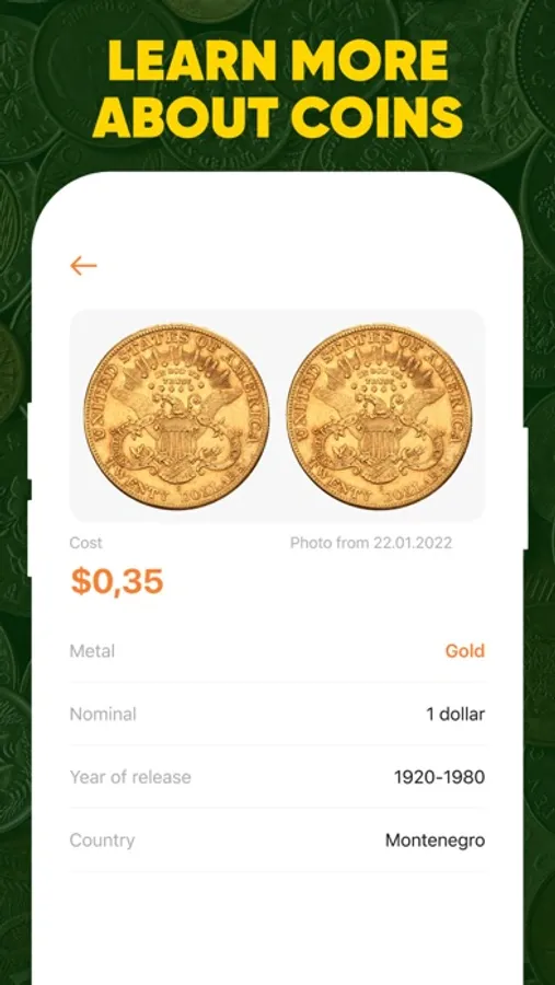 Information about the coin is provided in its basic criteria: name, country of issue, date, price. Our application provides the function of estimating the value of the coin. With this data, you can easily determine the value of a coin and make an informed decision to buy, sell and trade in the numismatic field.