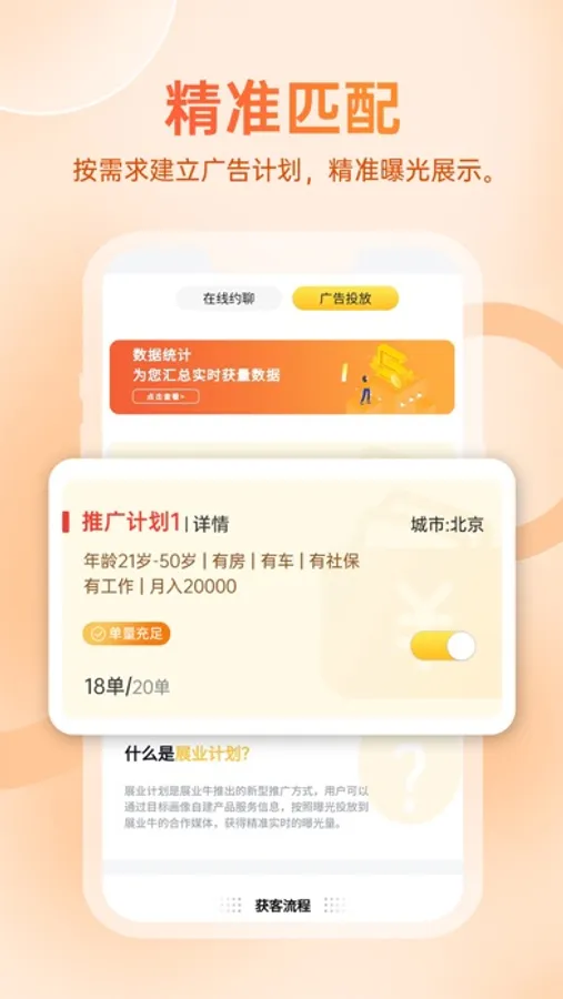 展业牛是一款移动获客展业平台,功能包含展业获客,客户管理,跟进记录等。展业牛融合多种展业工具,配备一对一服务,360度全方位解决信贷经理、信贷员展业难题,降低获客成本,快速成为开单王!