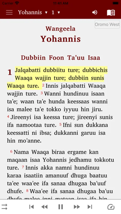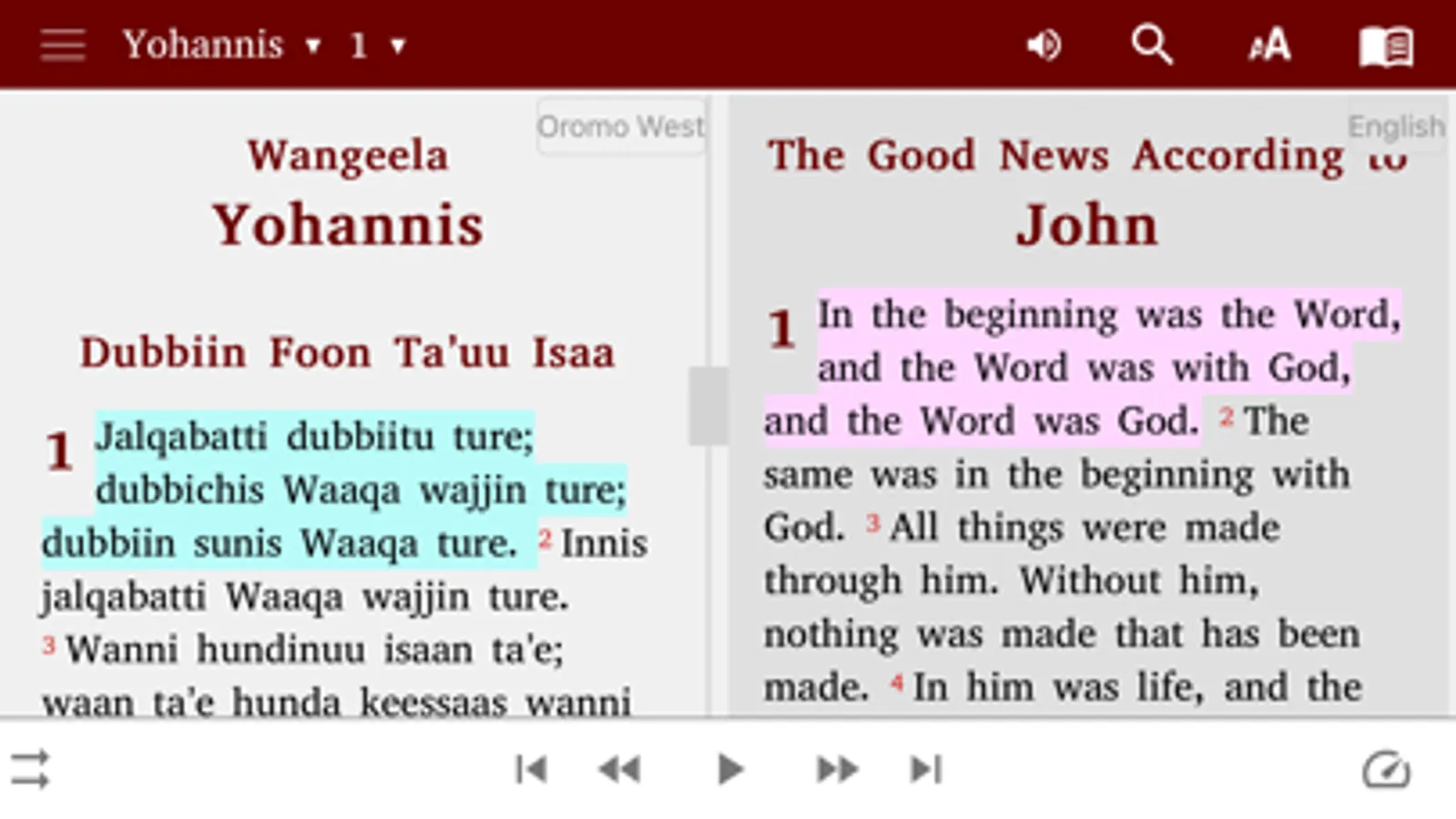 - "verse by verse" to display a verse in Oromo followed by the same verse in one of the other languages of your choice
