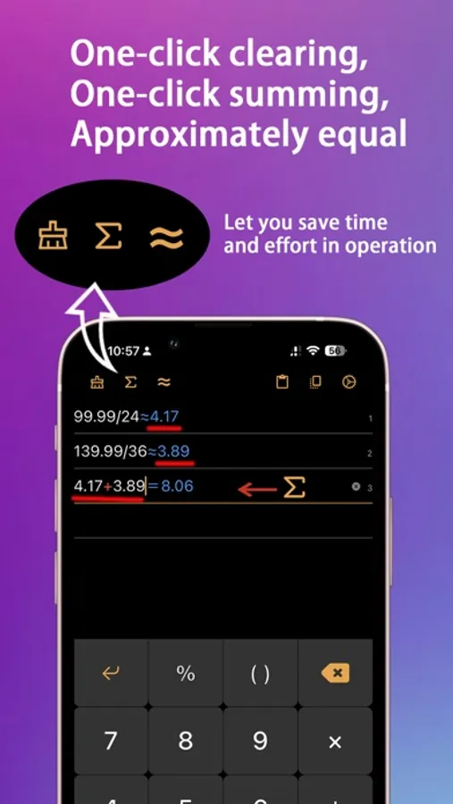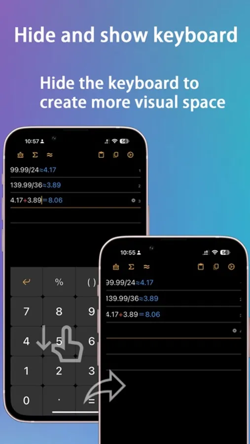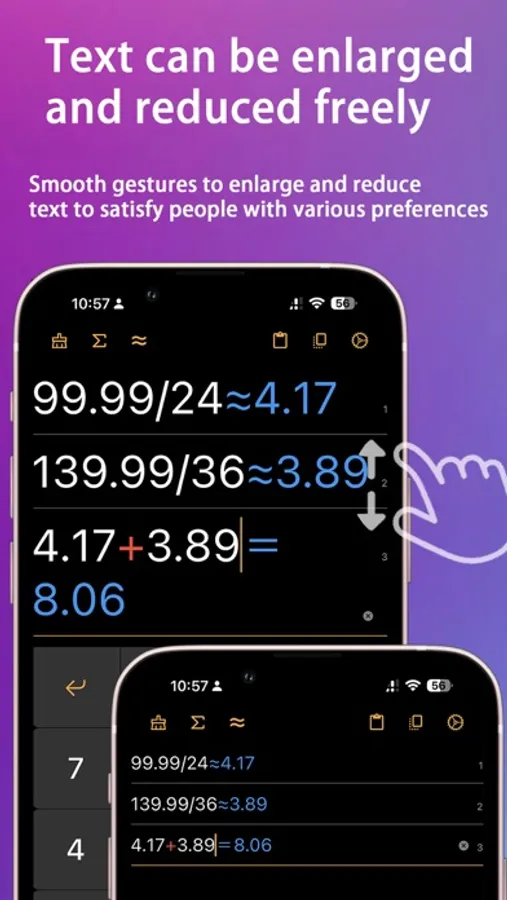Calculations can be displayed and entered in multiple lines in real time, and numbers and results can be changed anywhere.