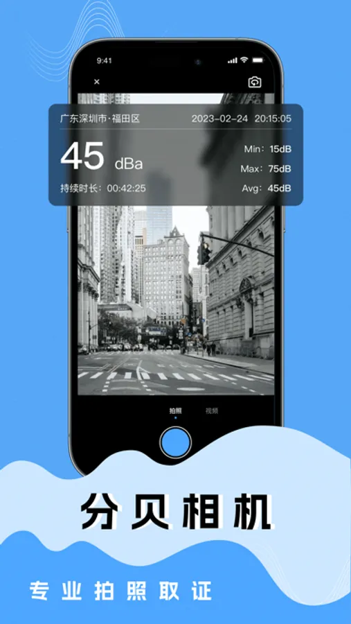 - 分贝水印相机,可将当前环境的分贝值大小、当前位置和时间信息以水印的形式显示在照片上