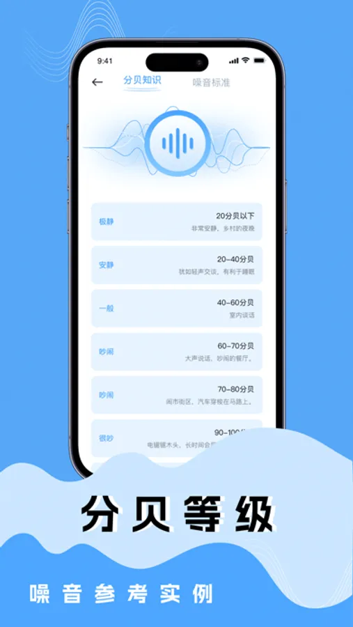 - 应用内置分贝等级表及噪音标准,实时对照判断当前环境声音是否为噪音,及时远离噪音污染源
