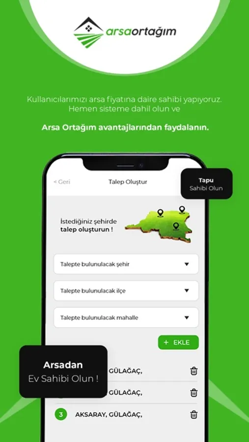 Yatırımcılar yatırım yapmak istediği şehri ve bölgeyi belirleyerek talepte bulunurlar. Taleplere en uygun arsa için açılan konut projesine başvuruda bulunabilirler.