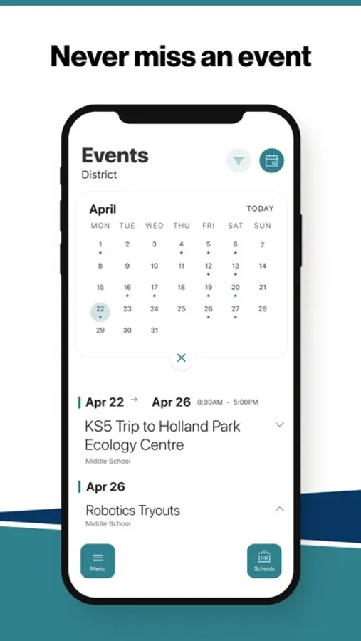 The event section shows a list of events throughout the district. Users can add an event to their calendar to share the event with friends and family with one tap.