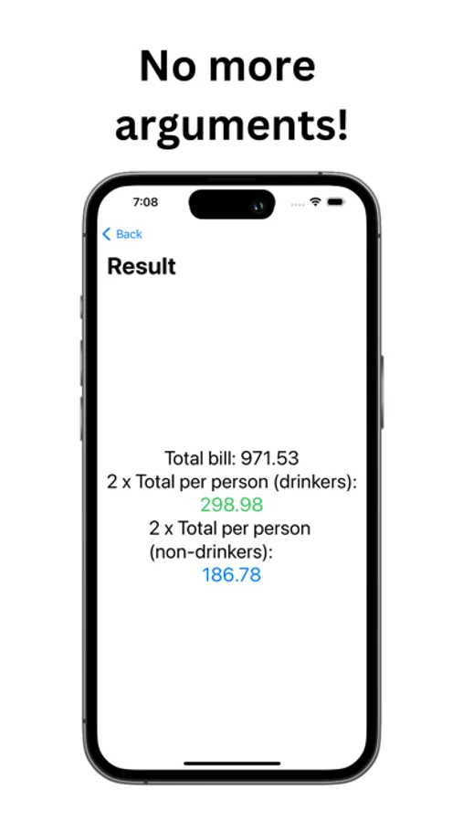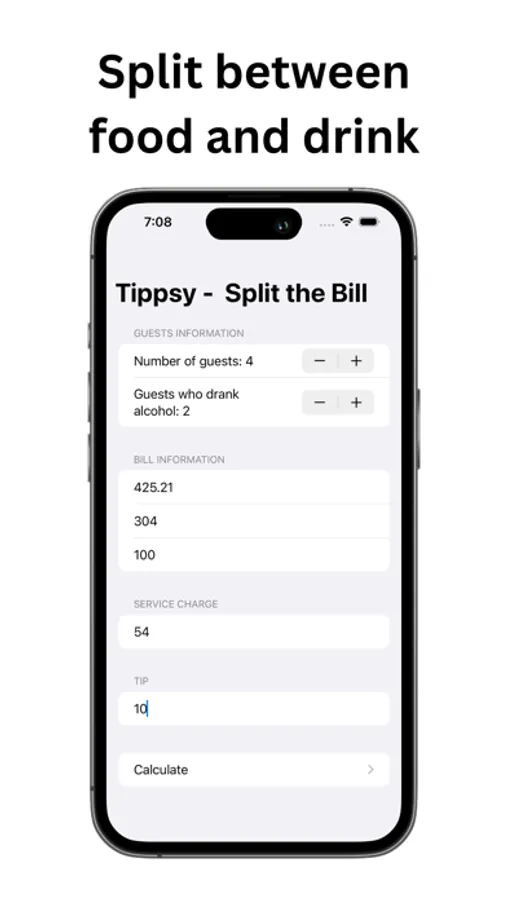 * Clear Breakdown: Each guest's individual total is clearly displayed, based on their share of the food, their drinks, and their portion of the service charge and tip. Non-drinkers pay for their non-alcoholic drinks, drinkers for their alcoholic ones - fair is fair!