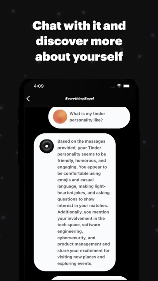 Discover your full self through uncovering your past. The Everything Bagel helps you uncover deep insights about your life through your tinder, spotify, and twitter history with an AI data assistant to help you along the way.